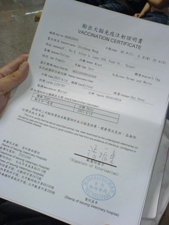 除了蓋好鋼印的"注射證明" 和"寵物輸入許可證"之外